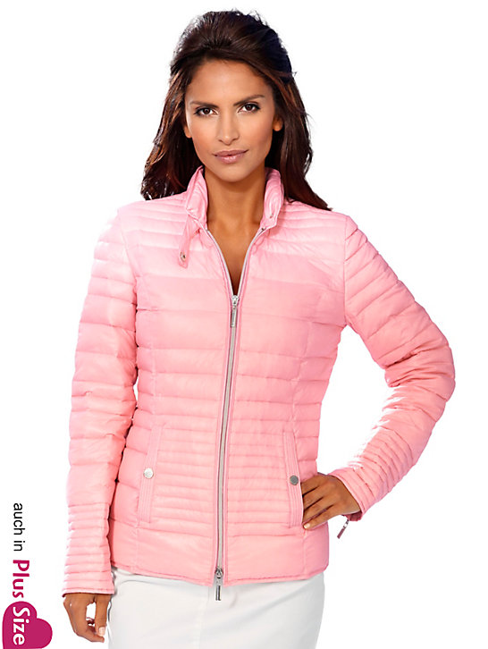 Hooded down jacket with front zipper opening and hand warmer pockets