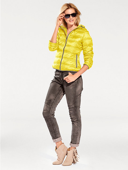 Hooded down jacket with front zipper opening and hand warmer pockets